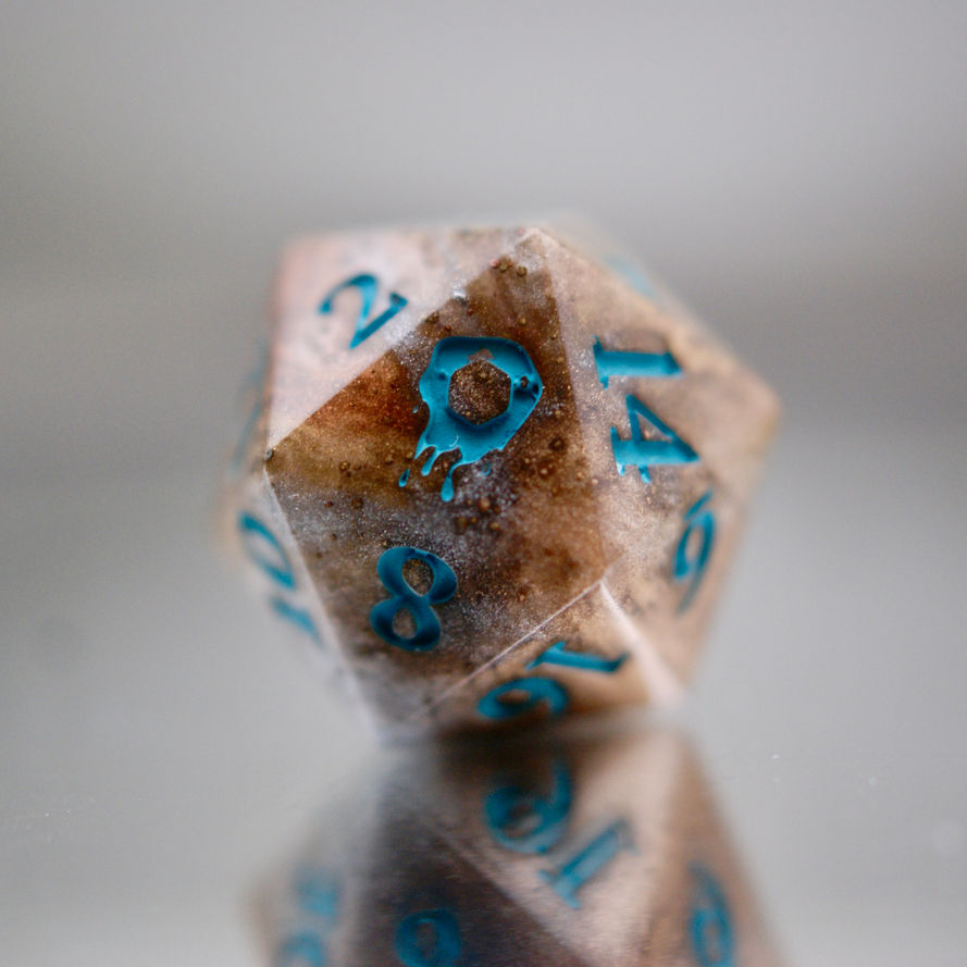 Arm your adventures with the Cog & Caliber dice set—where clockwork precision meets six-shooter swagger. Each resin piece flows with molten-brass veins and steel-dust swirls, while electric-teal numbering pops like a lit fuse. From the micro d2 “spark-igniter” through the crystal d4 “chamber,” to your trusty d20 “hammer fall,” these eight dice are built for artifice and aimed for impact.