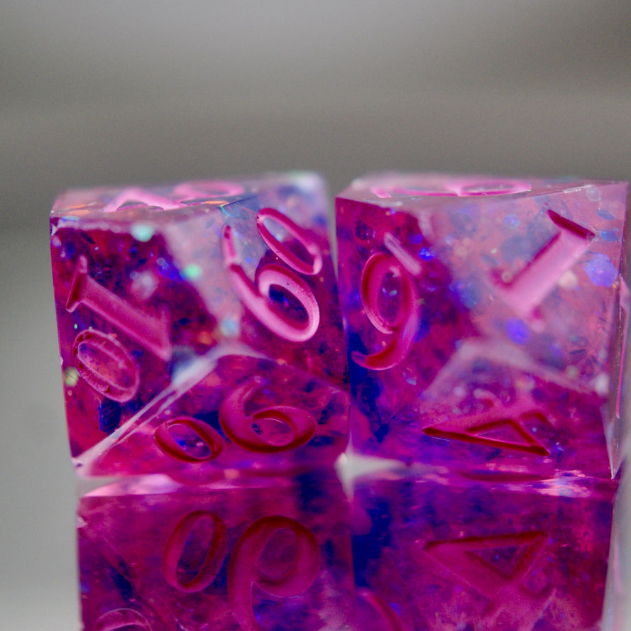 Introducing Spellberry Spark, the handmade resin dice set that proves you don’t need subtlety when you can have glitter instead. Swirled with brilliant pinks, magical purples, and enough iridescent sparkle to blind a unicorn, this set ensures you’ll never roll quietly again. With bright pink numbering that practically giggles at nat 20s, these dice are perfect for spellcasters, fae tricksters, and adventurers who aren’t afraid to glow.